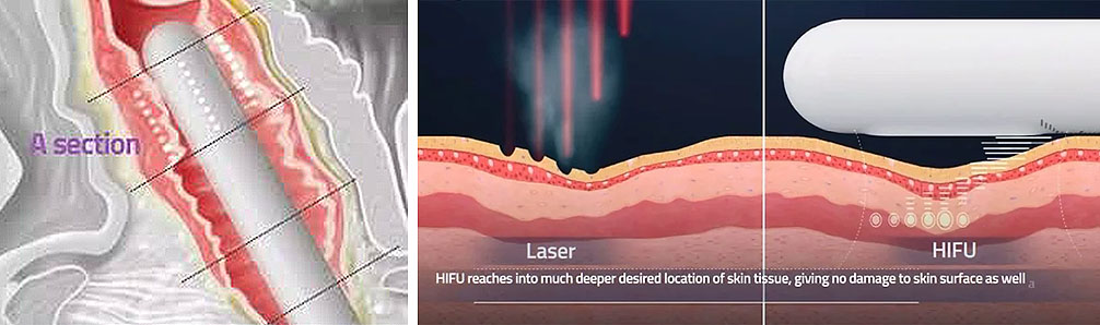 In recent years HIFU technology has been successfully applied in treatments of vaginal relaxation (VRS) and stress incontinence (SUI). Precise application of HIFU waves to vaginal walls at a depth of 3 to 4.5mm warms submucosa and mucous membrane to 65⁰C. This method practically instigates connective tissue of mucous membrane to regenerate. The treatment results in higher numbers of stronger, remodeled and narrowed collagen fibers which permeate and provide strength of vaginal walls. In addition, biostimulative effects of HIFU wave initiated regenerative processes have positive impacts on the elastic fibers of mucosa and pelvic muscles. Final results of the treatment are reflected by a narrowed vaginal canal with stronger, more resistant and healthier walls. All these effects are beneficial in the treatment of SUI hence why HIFU is also applied in treatments of first and second degree SUI whilst third degree SUI requires surgery. HIFU application in treatment of first and second degree SUI can significantly delay the development of third degree SUI and therefore delay or completely eliminate the need for surgical treatment.